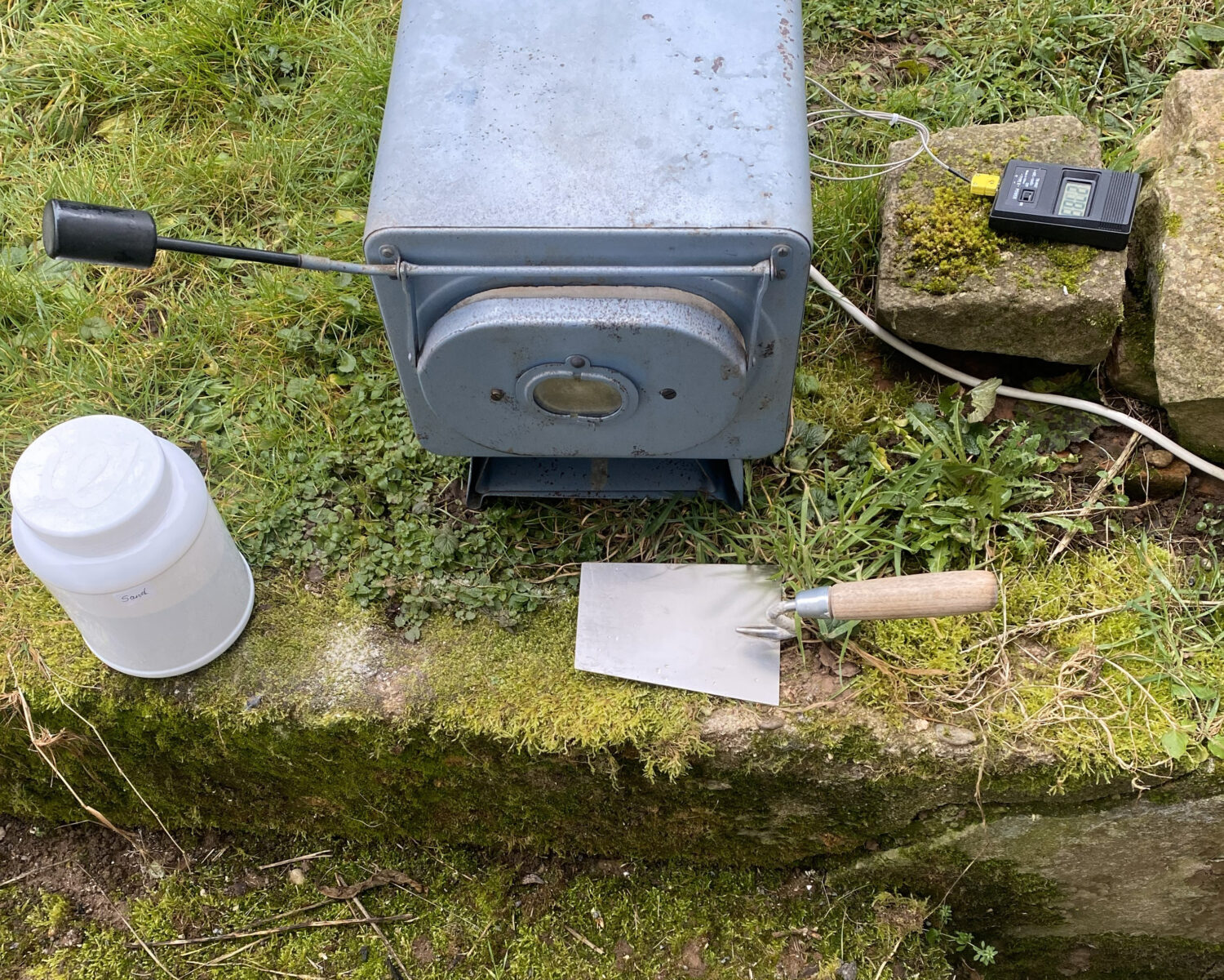 Das Arbeiten mit Magnesium hat sich nach näherem Hinsehen als eine ambivalente Angelegenheit entpuppt. Wegen Entzündungs- und Brandgefahidumfangreiche Vorsichtsmassnahmen zu treffen. Ab 450°C kann sich Magnesium entzünden. Es lassen sich daher auch keine haltbaren Hartlötverbindungen herstellen. Magnesiumbrände entwickeln Temperaturen bis 3000°C , sind im großen Maßstab schwierig löschbar und erfordern besondere Löschmittel (kein Wasser!). Um die Brandgefährlichkeit realistisch einschätzen zu können, habe ich Outdoor ein kleines Blech 27x41mm mit dem Gasbrenner erhitzt und auf einem Sandstein abbrennen lassen.