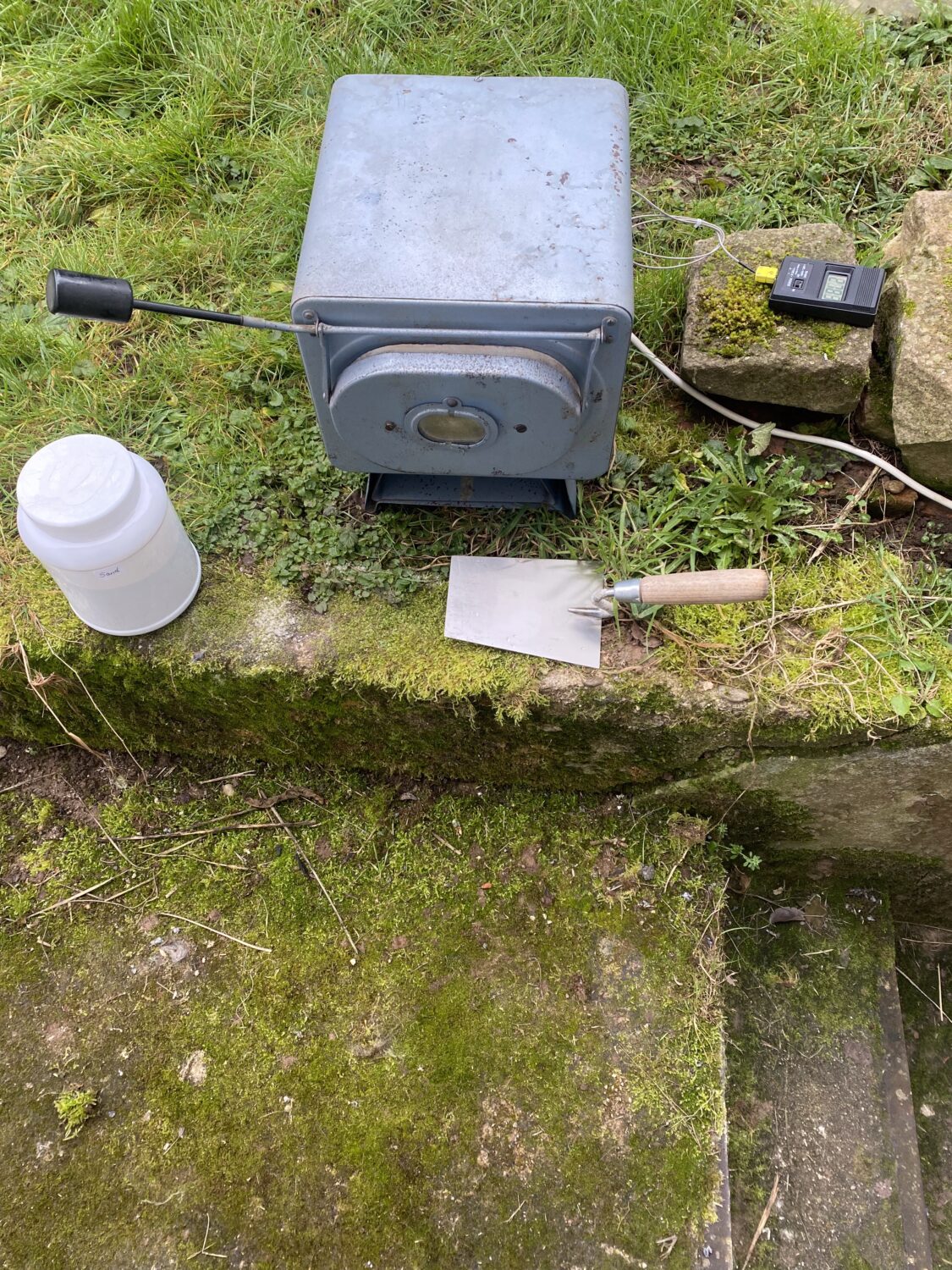Das Arbeiten mit Magnesium hat sich nach näherem Hinsehen als eine ambivalente Angelegenheit entpuppt. Wegen Entzündungs- und Brandgefahidumfangreiche Vorsichtsmassnahmen zu treffen. Ab 450°C kann sich Magnesium entzünden. Es lassen sich daher auch keine haltbaren Hartlötverbindungen herstellen. Magnesiumbrände entwickeln Temperaturen bis 3000°C , sind im großen Maßstab schwierig löschbar und erfordern besondere Löschmittel (kein Wasser!). Um die Brandgefährlichkeit realistisch einschätzen zu können, habe ich Outdoor ein kleines Blech 27x41mm mit dem Gasbrenner erhitzt und auf einem Sandstein abbrennen lassen.